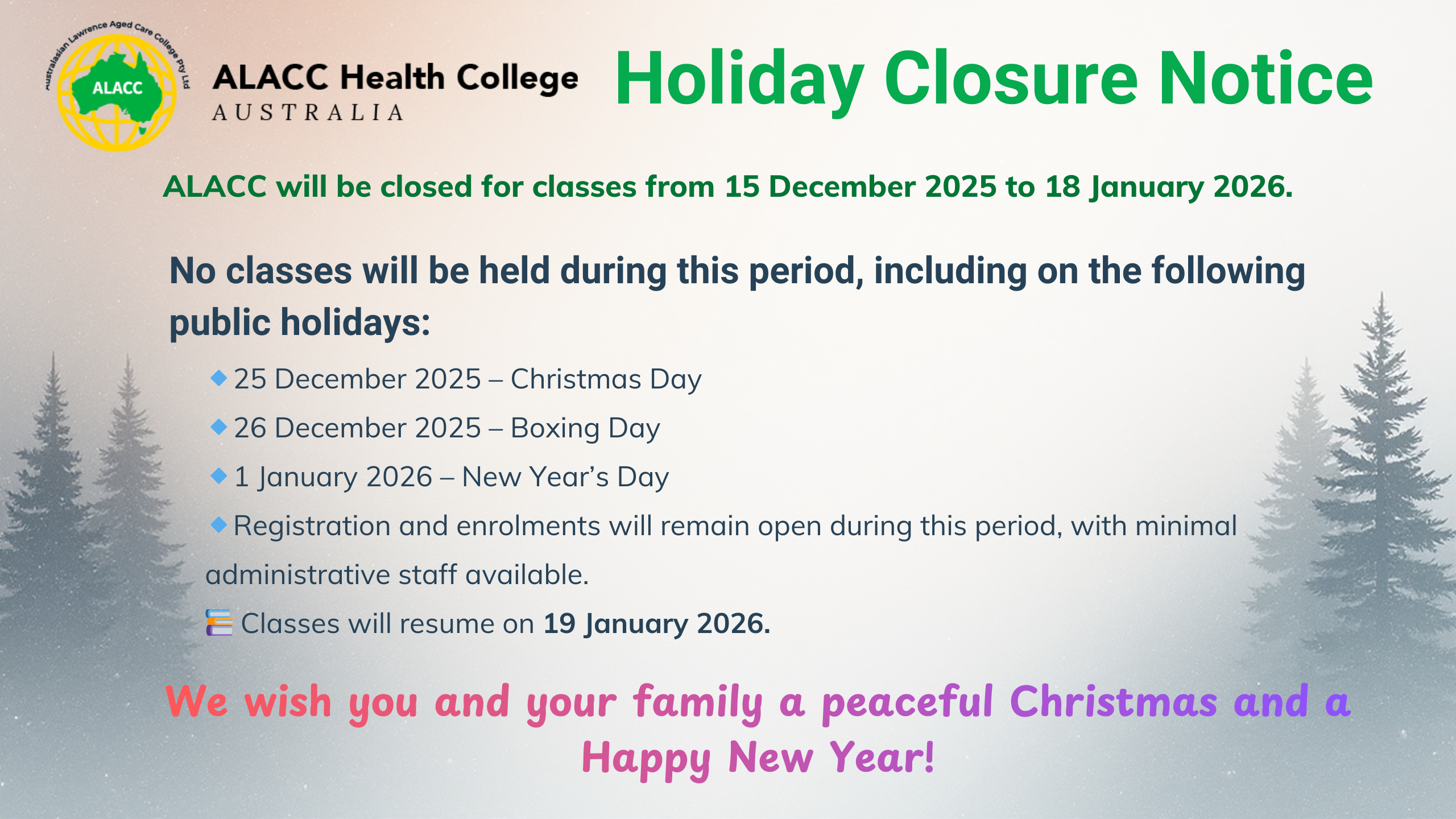 The campus has classrooms which are equipped with comfortable individual seating, adequate lighting, a computer and projectors. In order to provide practical experience, the College also contains a nursing laboratory equipped with beds, wheelchairs, and all resources and materials required for the provision of aged, nursing, health and community care services.